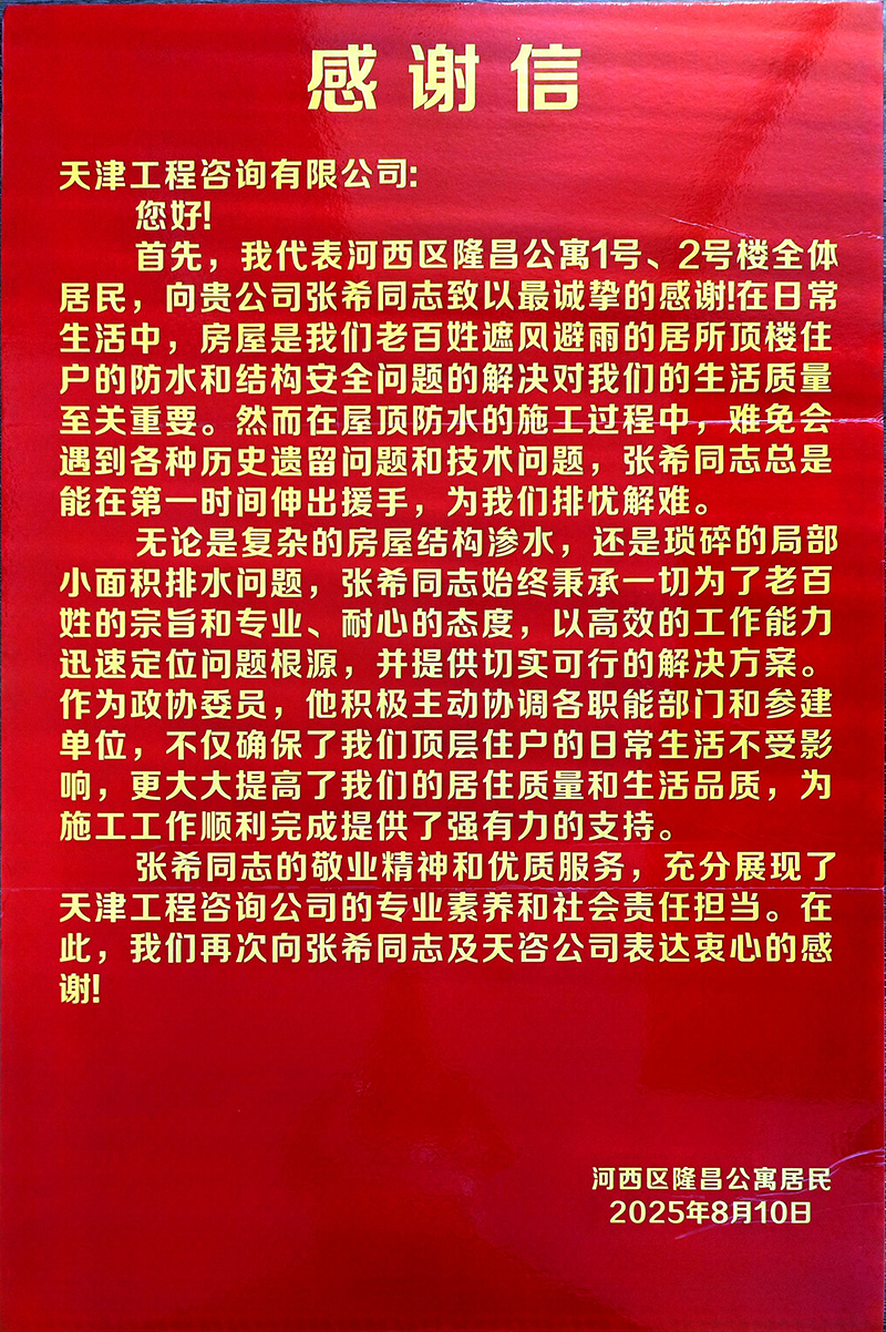 為有效促進(jìn)工程進(jìn)展,項(xiàng)目團(tuán)隊(duì)主動加強(qiáng)與居民、街道和社區(qū)的多層次溝通。在各小區(qū)設(shè)立聯(lián)絡(luò)點(diǎn),及時(shí)公開施工與監(jiān)理信息,迅速響應(yīng)居民關(guān)切。如隆昌公寓屋面滲水問題,團(tuán)隊(duì)僅用三天便協(xié)調(diào)解決,展現(xiàn)出高效務(wù)實(shí)的作風(fēng)。施工前主動告知計(jì)劃,協(xié)助居民做好防護(hù),合理安排作業(yè)時(shí)間避開休息時(shí)段,還為年長體弱居民提供搬運(yùn)幫助。這些細(xì)致入微的服務(wù)贏得了居民的廣泛贊譽(yù),特地送來感謝信,表揚(yáng)團(tuán)隊(duì)“專業(yè)、耐心、高效”。