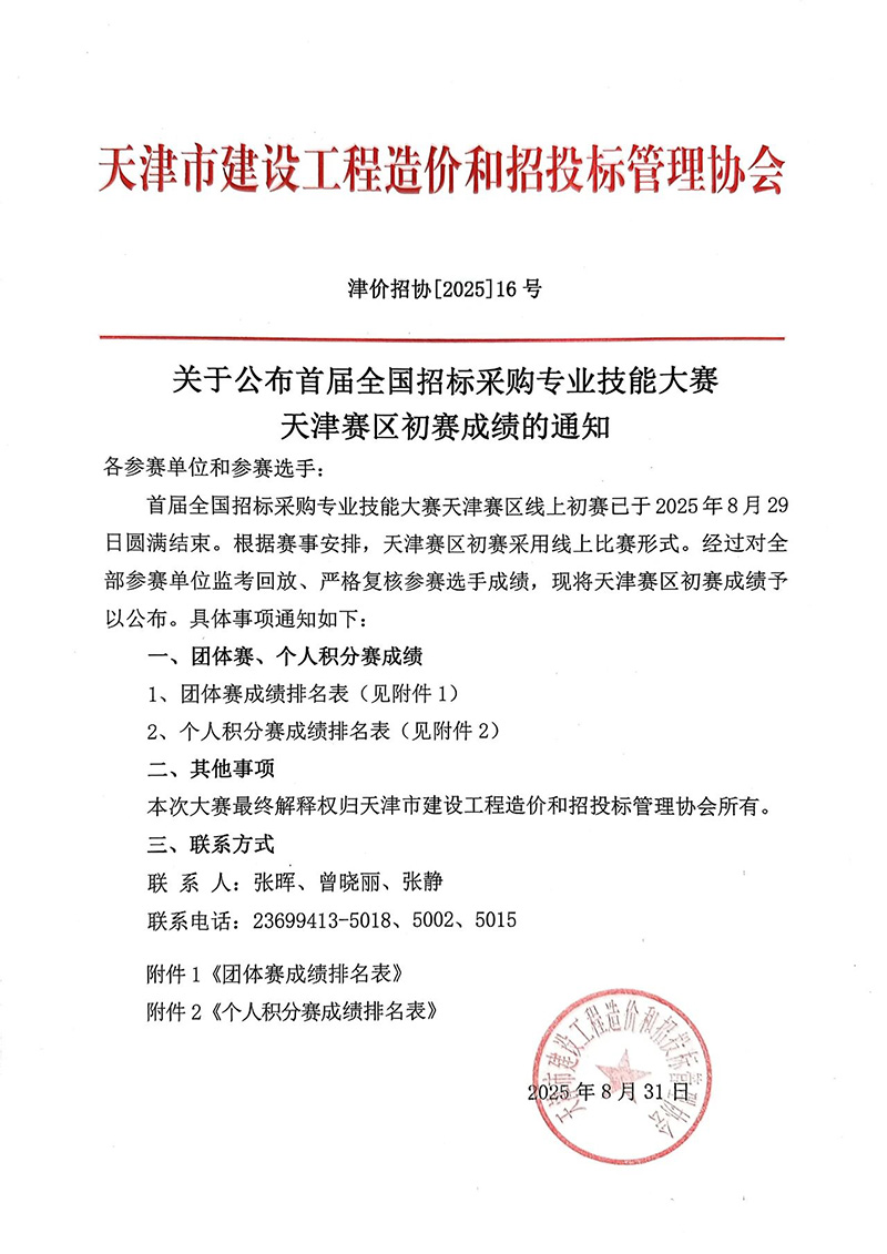 近日,由天津市建設(shè)工程造價(jià)和招投標(biāo)管理協(xié)會(huì)舉辦的首屆全國(guó)招標(biāo)采購(gòu)專業(yè)技能大賽天津賽區(qū)比賽圓滿落幕。此次天津賽區(qū)匯聚了全市25家優(yōu)秀企業(yè)和140名行業(yè)精英同臺(tái)競(jìng)技,天津咨詢所屬泛亞咨詢?cè)诩ち腋?jìng)爭(zhēng)中脫穎而出,斬獲團(tuán)體賽桂冠,武宇哲、石恩婧、張典等3名員工成功躋身全市個(gè)人積分賽排名前十,充分彰顯了泛亞咨詢?cè)谡袠?biāo)采購(gòu)領(lǐng)域的專業(yè)實(shí)力與人才優(yōu)勢(shì)。